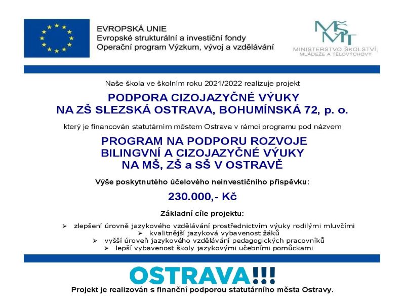 Dne 14. února 2023 se uskutečnil na ZŠ Bohumínská již tradiční Den otevřených dveří, tentokrát s názvem „Hola, hola, škola volá!“. Jednalo se o setkání vyučujících s předškoláky a jejich rodiči. Pro budoucí prvňáčky byla připravena hodina, ve které si hravou formou vyzkoušeli být školákem, sedět v opravdové školní lavici, odpovídat před tabulí, hlásit se, naslouchat si navzájem. Děti plnily nelehké úkoly, které s přehledem zvládly. Zjistili jsme, že budeme mít šikovné prvňáčky. Doufáme, že děti rády vymění mateřskou školu za školu základní.