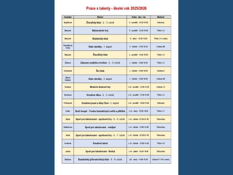 Také v tomto školním roce 2025/2026 se naši pedagogové věnují talentovaným žákům i mimo vyučování.